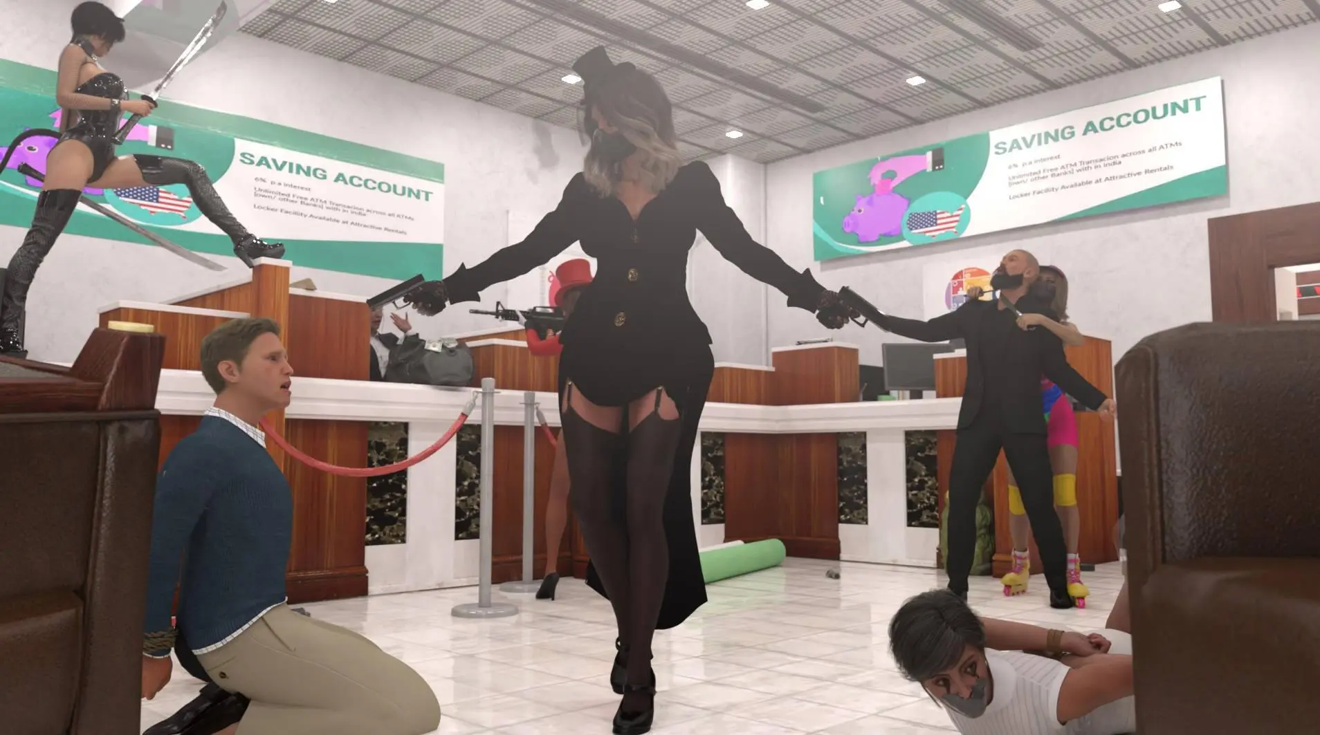你是一名狡猾的联邦调查局特工。四个美丽的女孩正在抢劫银行。